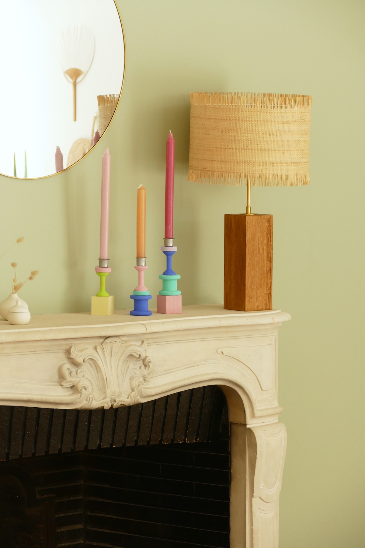 Peignez les formes de bois dans les couleurs de votre choix, puis laissez-les sécher. Pour un effet glossy, passez une couche de vernis. Collez les différentes parties en les empilant les unes sur les autres et en variant les hauteurs, formes et couleurs. Pour assurer une bonne adhérence, appuyez 10 secondes sur la composition, et laissez-la sécher 24 heures. Au sommet des bougeoirs, collez le support pour bougie en métal.