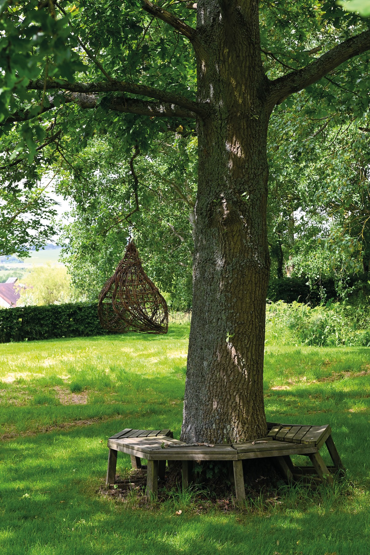 Invitation au repos. Dans le fond de la prairie, un vieux banc circulaire permet de profiter du paysage sous tous ses angles. Cette partie du jardin, très calme, libre et sauvage, invite les visiteurs à la rêverie et au repos.