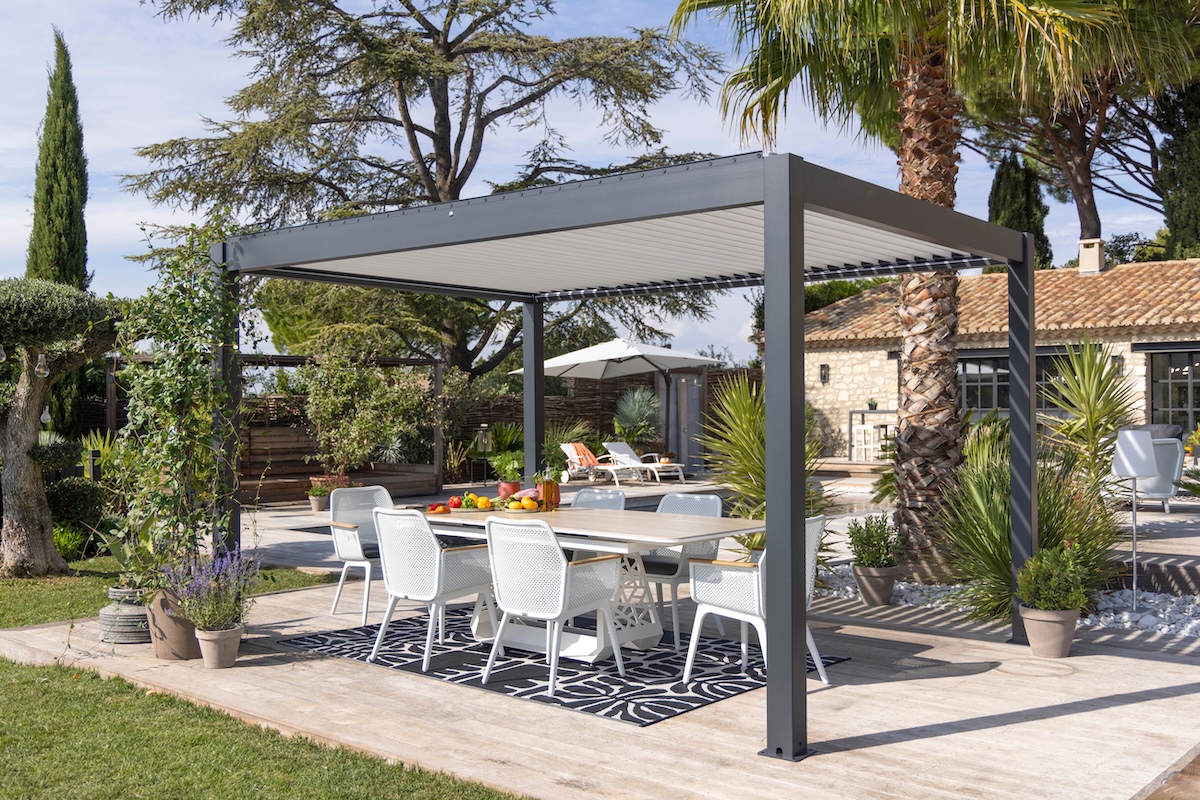 Pour une solution robuste et durable, optez pour une pergola. En bois ou en métal, elle peut être couverte de canisses, de tuiles ou encore habillée de plantes grimpantes qui procureront une ombre rafraîchissante. Plus contemporaine, la pergola bioclimatique est équipée de lames orientables en aluminium qui permettent d’ajuster l’ombre selon l’heure de la journée. Certaines versions sont motorisées et intègrent des capteurs qui adaptent automatiquement l’ouverture des lames en fonction du vent et de la pluie.