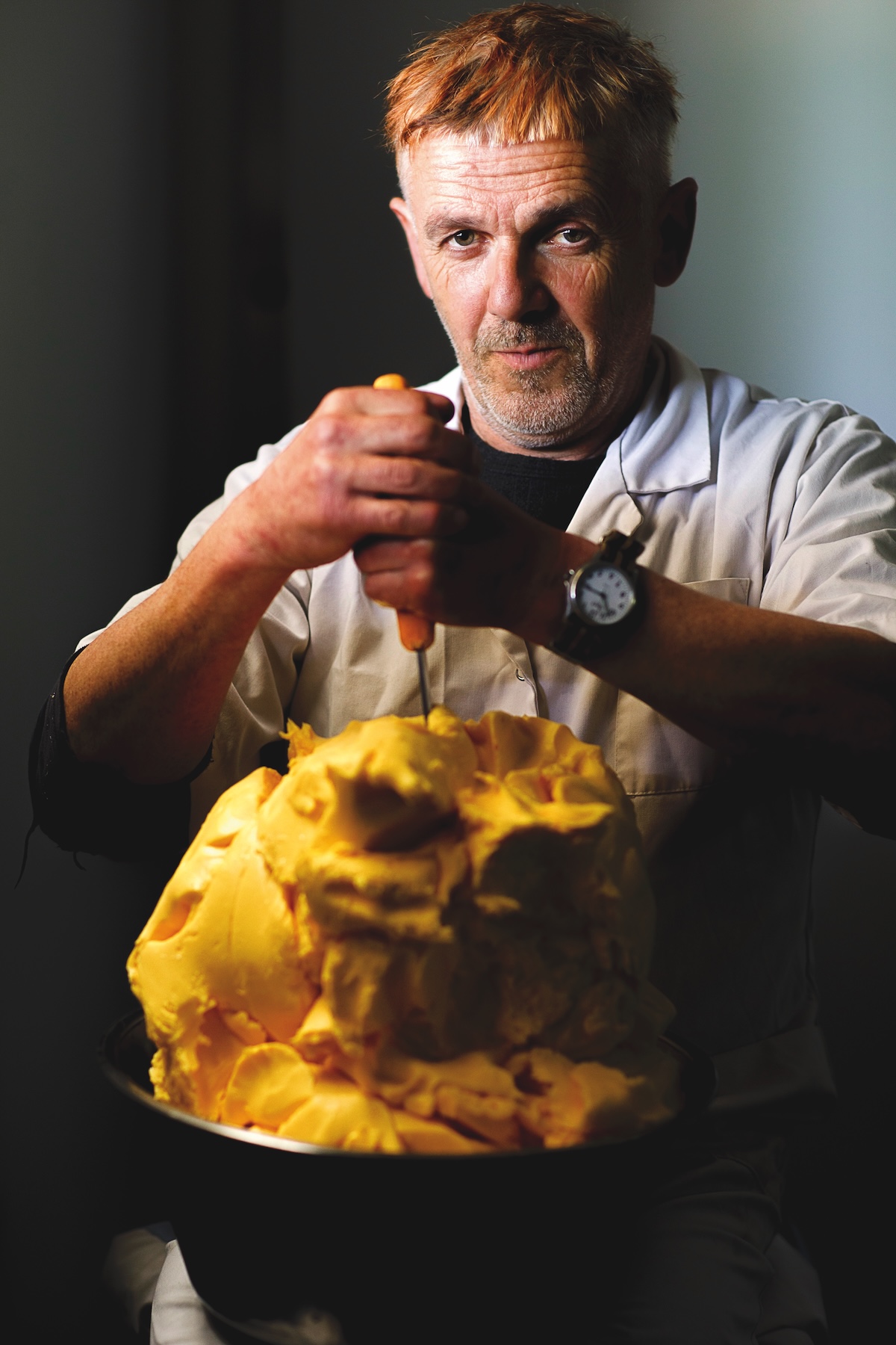 Stéphane Terlet est éleveur et producteur de beurre fermier. Fabriqué avec la crème du lait de ses vaches Froment du Léon, son beurre est jaune comme l’or et a un goût exceptionnel (unique en Bretagne et ailleurs). Il en met dans le far breton, qu’il cuisine avec le lait de sa ferme. Si vous passez par Saint-Brieuc le jour du marché, allez goûter son beurre et son far breton. Vous ne le regretterez pas ! Couleur Froment,