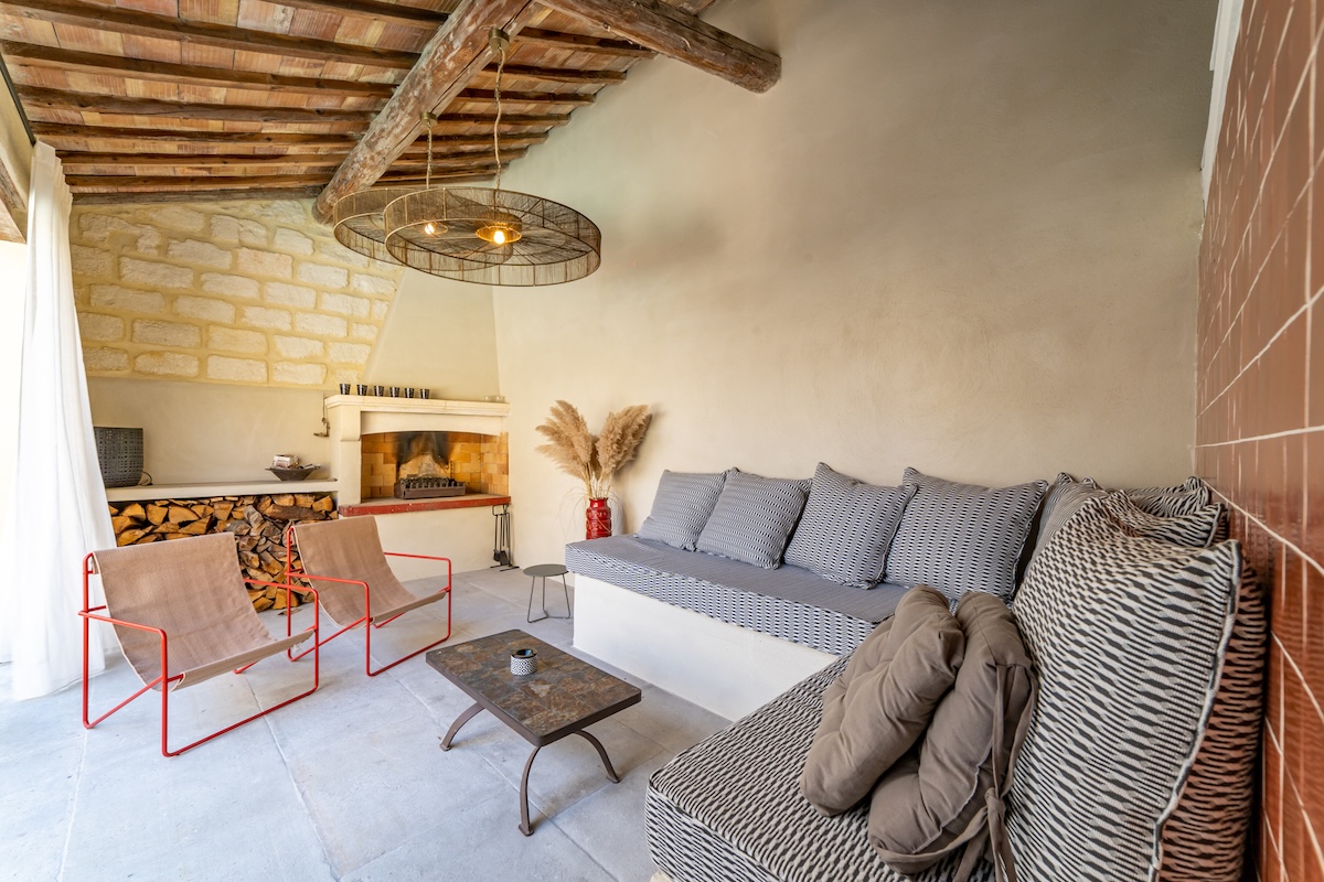 Été comme hiver. À l’abri du vent et du soleil, c’est ici qu’on se retrouve à l’heure de l’apéritif. Éclairé par de splendides suspensions (Athezza), le préau est un espace convivial et confortable, dont on peut profiter en toute saison.
