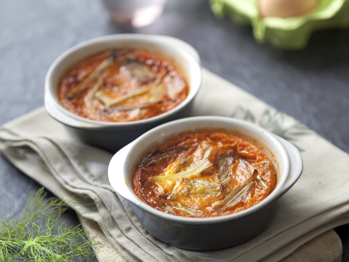 Répartissez les lamelles de fenouil dans des ramequins, recouvrez-les de la préparation aux poivrons, saupoudrez de thym et enfournez.