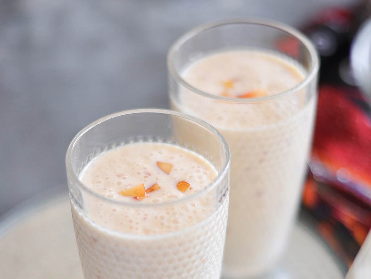 Mixez les pêches avec le yaourt, le lait, le sucre et la cardamome.
